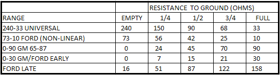 Below is a chart of common sender values and their approxamate resistance outputs, these are general and may be within a few ohms during testing.